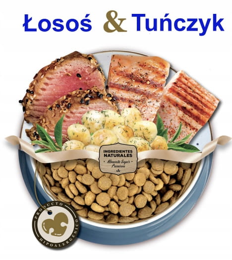 Karma NATURAL DOG GRAIN FREE Łosoś & Tuńczyk to karma naturalna, bez zbóż, o wysokiej zawartości białka. Karma hipoalergiczna, wskazana dla psów z wrażliwym układem pokarmowym lub z nietolerancją pokarmową. Karma nie zawiera kurczaka ani tłuszczu z kurczaka.